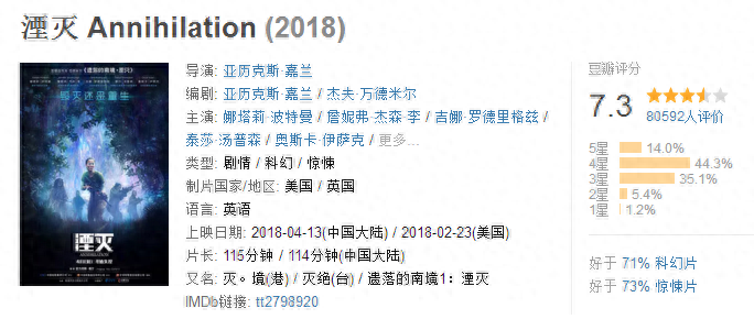 豆瓣7.3分,虽然是科幻片,也有些惊悚感。比起那些往常的科幻大片的震撼的视觉特效,《湮灭》更多的的有一种细思极恐的感觉。故事从这个有着奇幻色彩的保护罩一样的东西“闪光”开始讲起