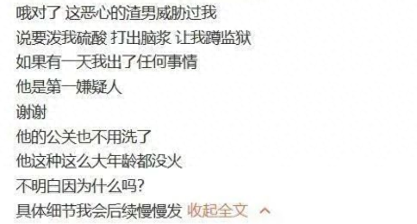 除了疑似劈腿三个女生之外,酷格还称张超威胁过她,要泼她硫酸,把她打出脑浆,让她蹲监狱.......