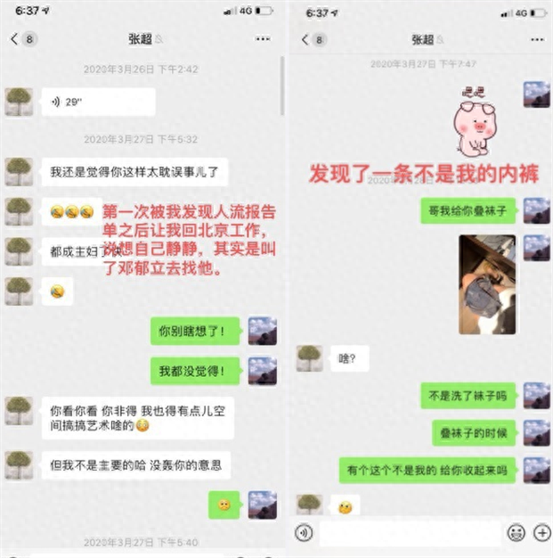 果然,在今年3月底的聊天中,酷格在张超住的酒店发现了一条女人的内裤,这条内裤在接下来酷格的爆料中,被证实是“小三”二号邓郁立的。