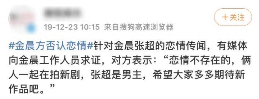 但当时金晨方面很快做出回应称:“恋情不存在,只是一起在拍新剧,请大家多多期待新作品。”