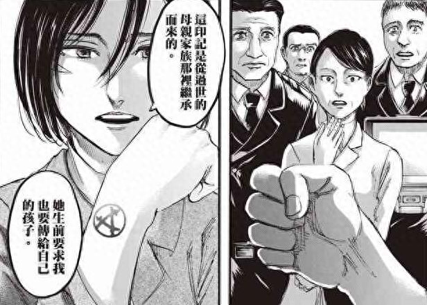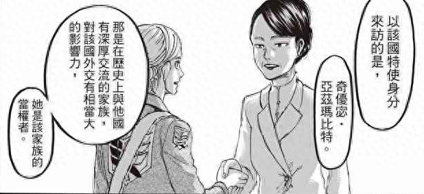 这个方向下,白发贝雷帽男子可以是“希斯特莉亚”肚中孩子的父亲;韩吉、艾伦间的对话,几乎围绕着“希斯特莉亚”展开,也似乎有些不寻常的意味:一者,艾伦或许与希斯特莉亚怀孕有关,所以韩吉的意思要让艾伦“负起责任”;二者,艾伦毫无征兆地出走,说出一席话却不再关注希斯特莉亚的后续,那么,韩吉很可能是要艾伦对自己所说负责,合理寻找其他的可能。