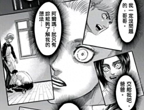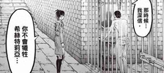 那么,如果说“我当时深信,你不会牺牲希斯特莉亚”是艾伦对韩吉所言,会上的表现都早已能让艾伦方向这些妄想。试想下,开会时都没明确为女王“维权”,能指望着自己走后,希斯特莉亚不被队友出卖?因此,这句话若是韩吉所言,便有足够的内容支撑:艾伦明明反对让希斯特莉亚为此牺牲,却还是让她介入这一事件当中,或许能说得清许多。