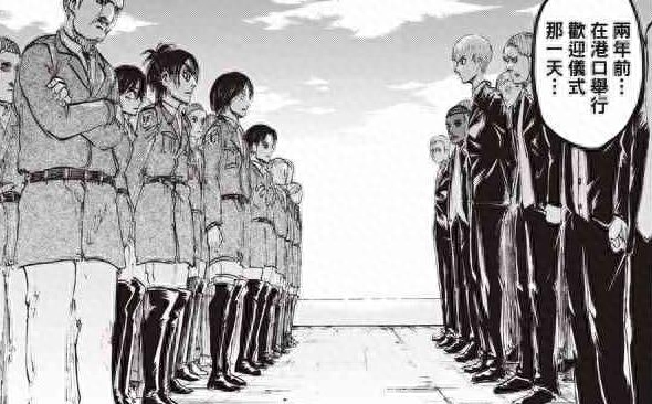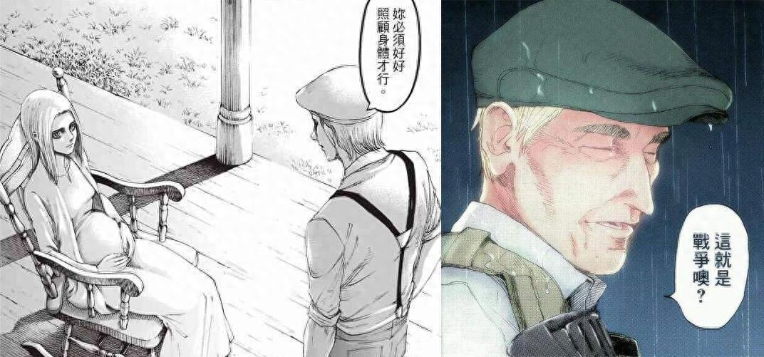 也就是说,853年码头造好,迎来希玆尔国来访的事件,首先提出希斯特莉亚应该成为“生育工具”的论调,艾伦也因为反对,所以理所应当孤身潜入马莱,寻找其他的解决方案。而从新一话末尾处,希斯特莉亚要顶着这么大的肚子,少说也要有8个月。这么一来,这个画面的时间点应该是艾伦归来之际,画面中白发(金发)贝雷帽的男子,便不是我们认知里的某位。