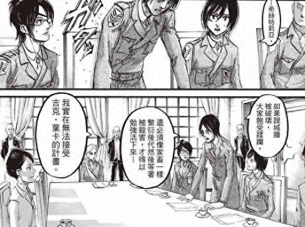 在“怀孕”画面之前,新一话为“女王怀孕”增加筹码的对话,无疑是监狱里艾伦与韩吉,关于“我当时深信,你不会牺牲希斯特莉亚”那句的归属问题(对话框十分巧妙地设置在两人之间)。从一年前希玆尔国来访来看,当东洋国向艾尔迪亚提出吉克的建议,整个墙内世界的管理层中,唯有艾伦一人公然反对,就连希斯特莉亚本人,都已经接受“命运”的安排。