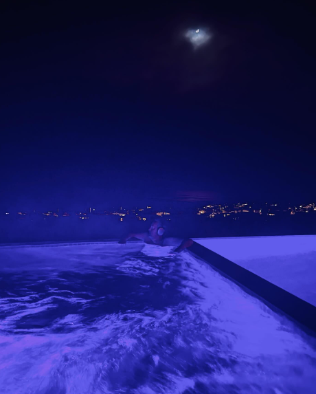 5天前,马修发布了最后一张照片,他在冷夜中泡温泉,戴着耳机很是享受。