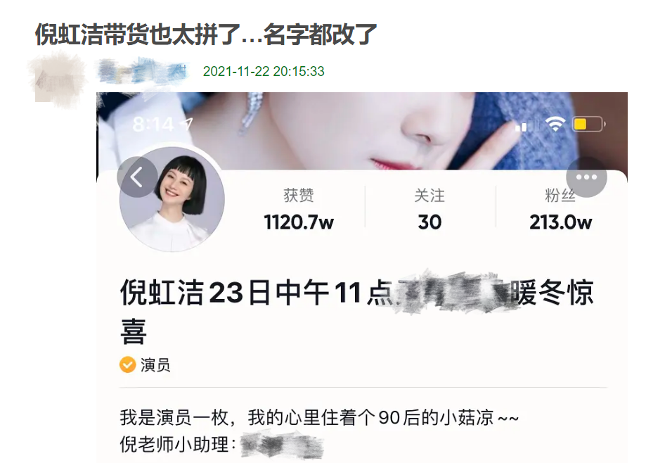 许是因为演艺事业遇到了瓶颈,倪虹洁开始尝试直播带货。她倒是也很拼,直接将账号昵称改成了金主爸爸的产品。