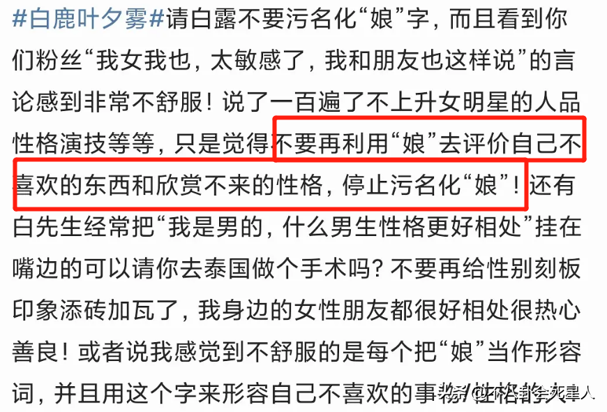 针对这些言论,网友看不下去了,有理有据地说明为什么白鹿的言行会让人不舒服。“不要再利用‘娘’来评价自己不喜欢和欣赏不来的性格了,停止污名化‘娘’!”
