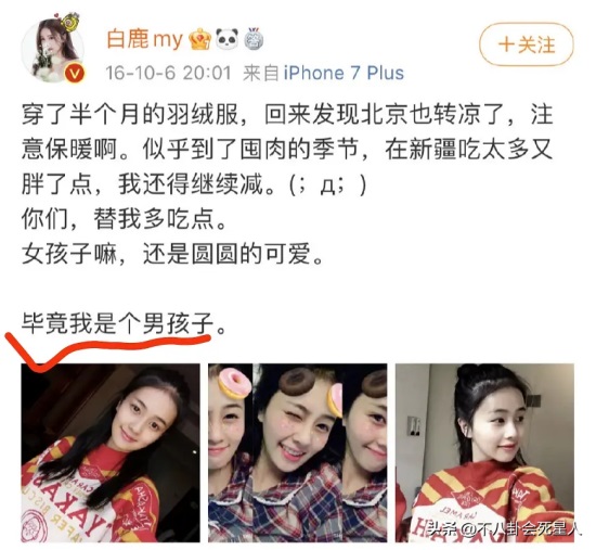 很明显的,白鹿是个女明星,但她从出道开始,就经常以男性视角自称,话里话外的都把自己排斥在女性性别之外。比如她会说:冬天到了我要减肥了,因为我是“男孩子”,不能像女孩子一样囤肉长胖。