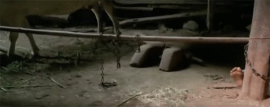 仆人被打死,卡尔姬则被抓回去,像牛羊一般,用铁链锁住,关在牛棚里。