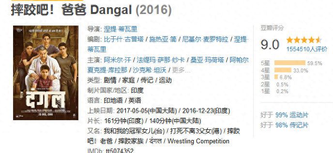 NO.1 印度《摔跤吧,爸爸》摔跤,豆瓣9.0