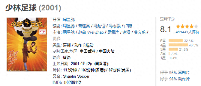 NO.4 中国《少林足球》足球,豆瓣8.1