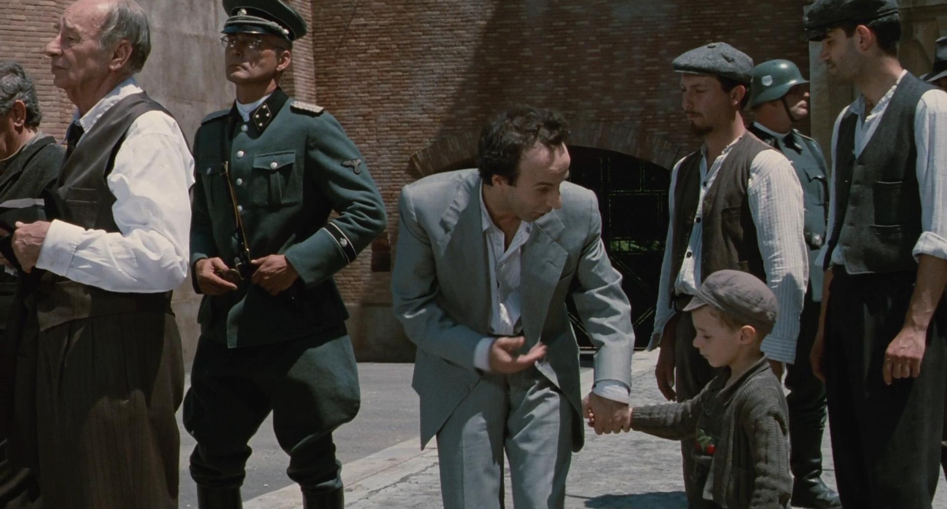 可是好景不长,幸福的生活随着二战的到来被打破了,一家人被抓进了集中营,其实多拉不是犹太裔,她可以不用去的,但是她深爱着自己的丈夫和儿子,为此她毅然决然的跟随丈夫和儿子一起来到了人间炼狱,也正是在集中营的这段生活,才造就了影片最难能可贵的东西,父爱,母爱,以及父母之间的伟大爱情,它感动了无数人,尤其是圭多对儿子的父爱,让无数人动容,潸然泪下