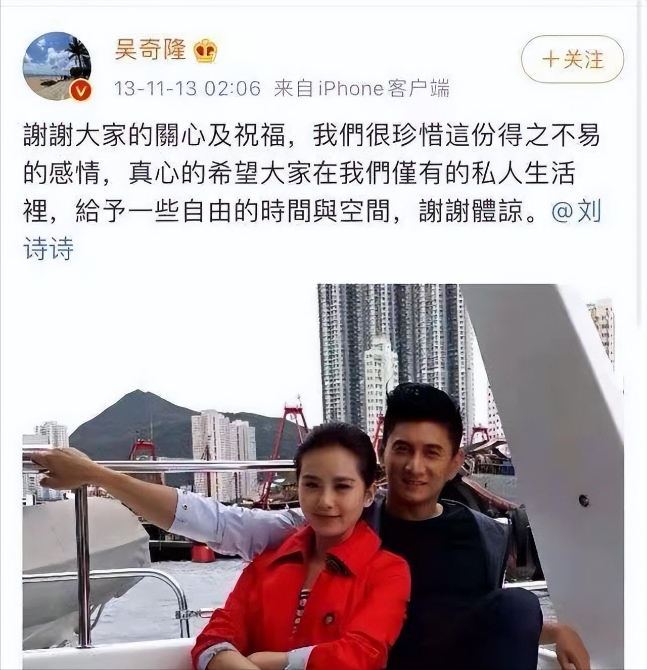 刘诗诗也曾发文称:两人并非恋人,只是普通朋友。在一阵吃瓜声中,很快众人的目光就被另一条消息吸引了,2013年11月13日,吴奇隆微博发文承认和刘诗诗的恋情。