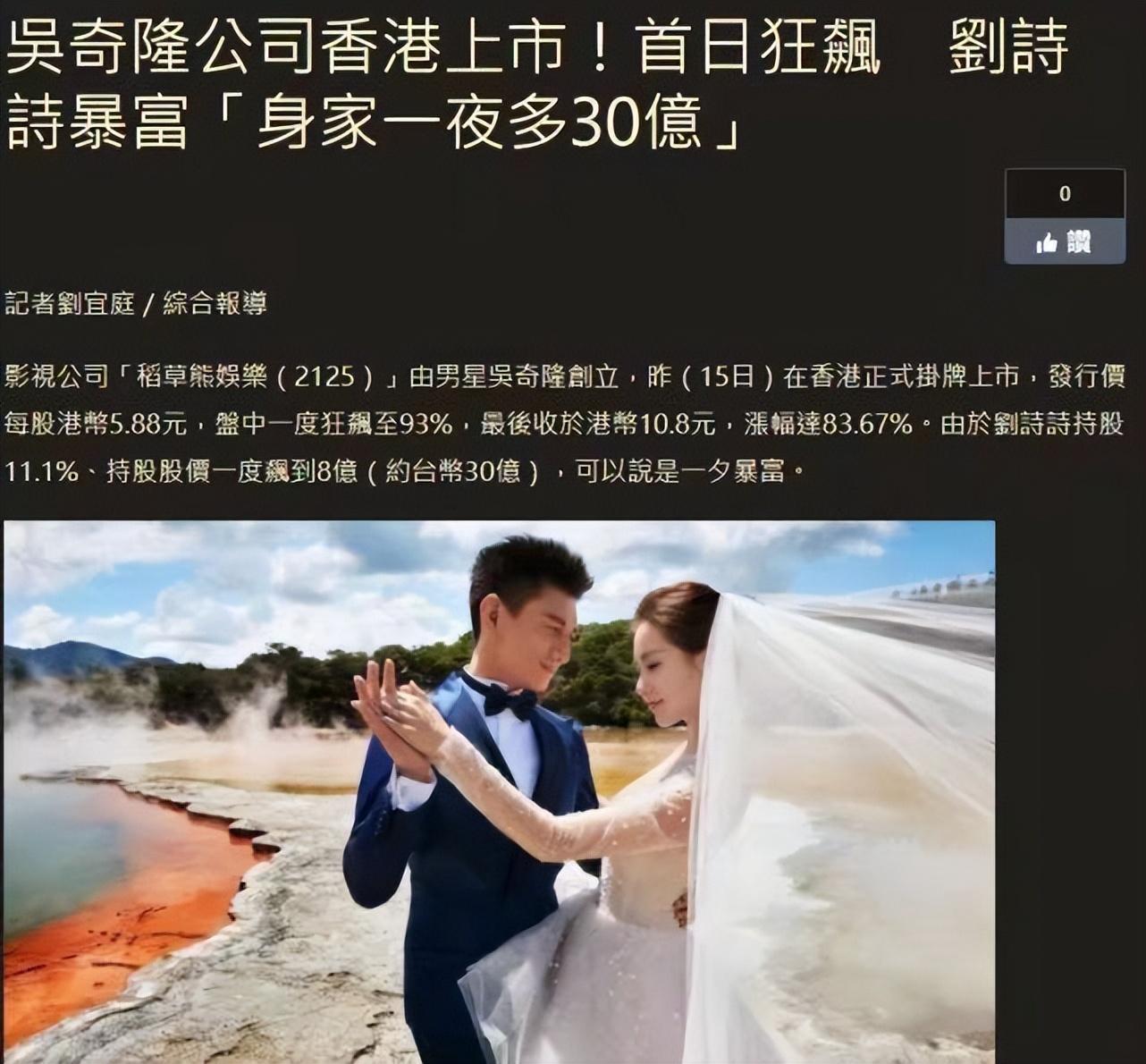 2021年1月16日,吴奇隆公司在香港上市,一夜之间刘诗诗的身家暴涨8亿港元,完成了从量变到质变的一个过程,成了一个妥妥的女富豪。