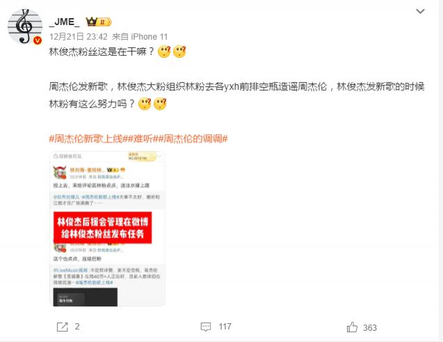 周杰伦的粉丝说林俊杰的粉丝有组织有预谋的给周杰伦的专辑新歌打差评。