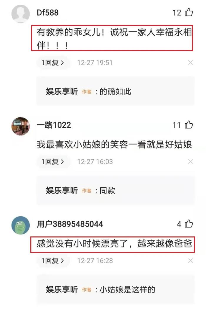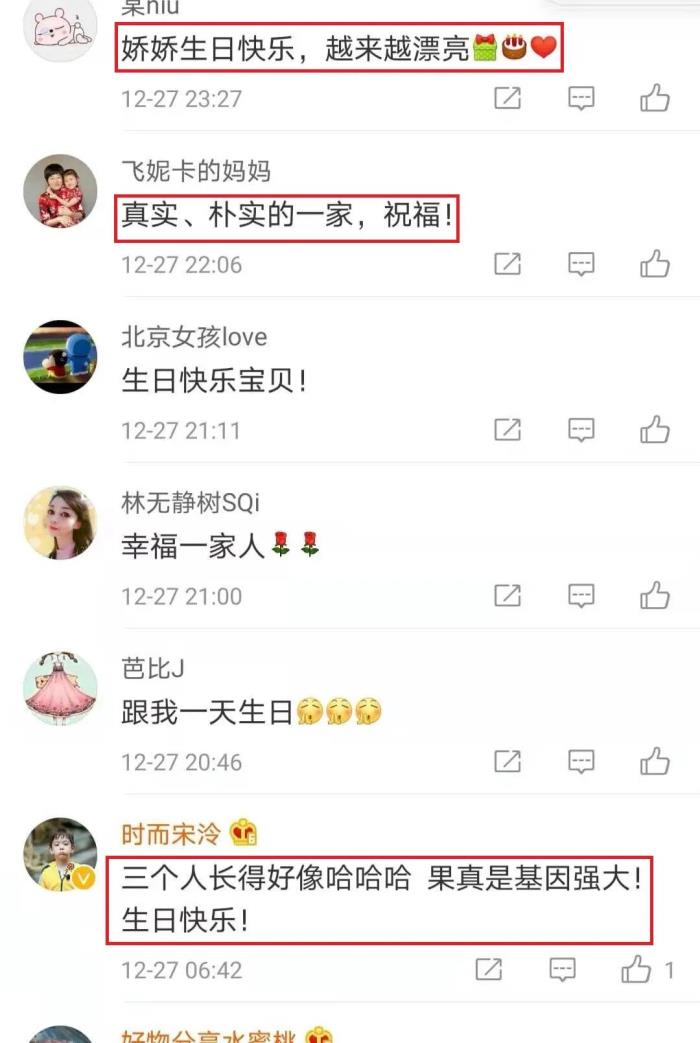 不少网友在看到之后纷纷都送上了祝福,有网友表示“三个人长得好像,果真是基因强大”!还有网友表示“真实、朴实的一家,祝福”!还有网友表示“感觉没有小时候漂亮了,看上去越来越像爸爸了”。还有网友表示“有教养的乖女儿!诚祝一家人幸福永相伴”。