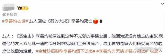 而李善均的友人也在第一时间接受了采访,提到李善均被牵连到这种不光彩的事情之后心理压力很大,当时在警方还没有拿出证据之前,李善均的朋友和家人都遭受到了牵连,甚至出现了很多不符合事实的造谣,这些强加给身边人的压力让李善均感到非常痛苦和自责。
