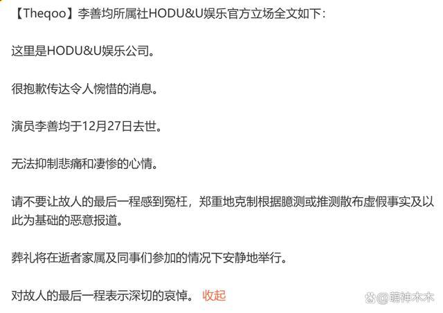 12 月 27 日,李善均突然身亡引发热议,经纪公司稍后发布声明,确认了李善均去世的消息。