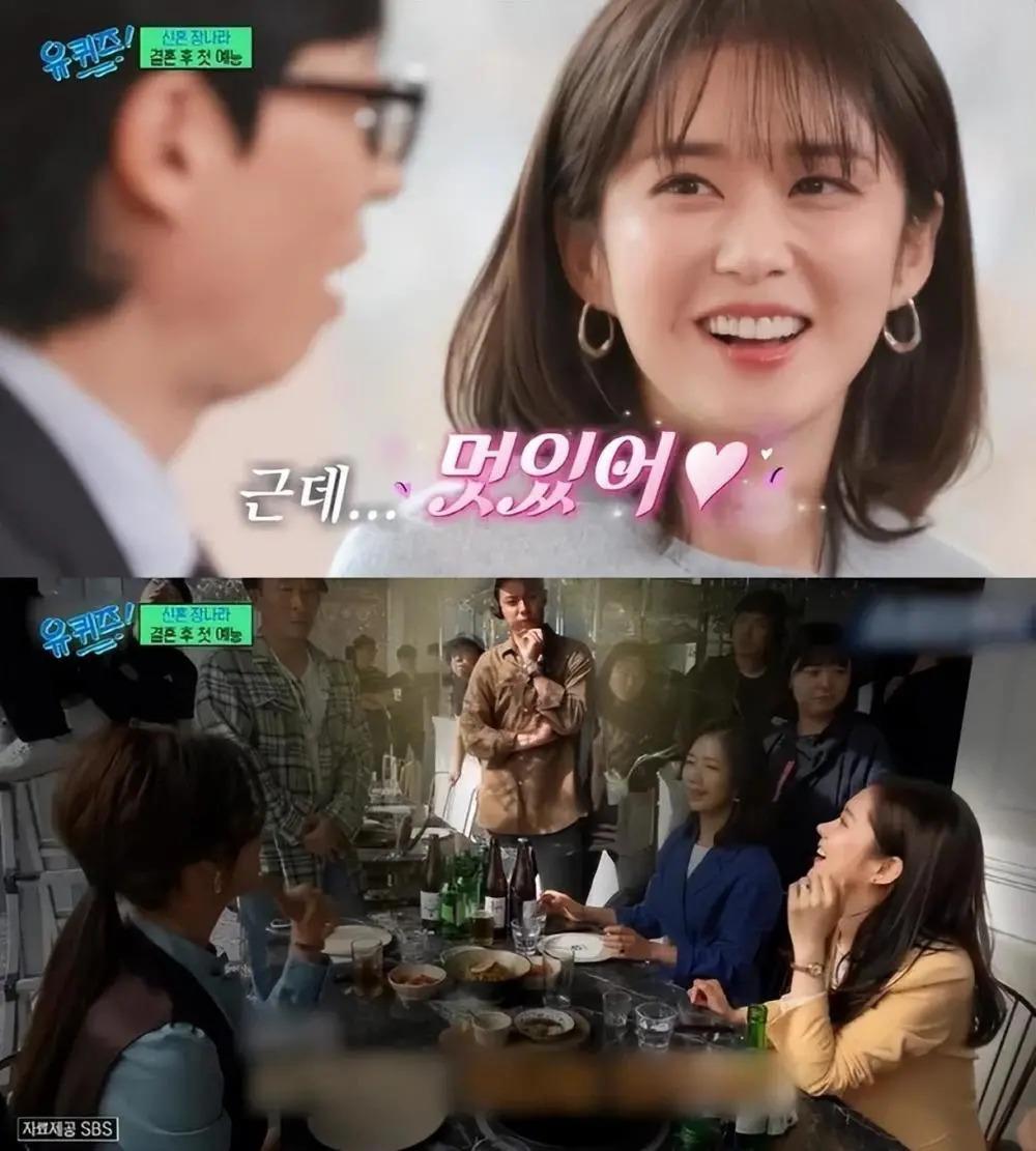 当天,当张娜拉的丈夫的真面目被曝光时,刘在石称赞他说:" 他很帅 " ,又调侃道:" 想想就这么好吗?",对此,张娜拉夸耀道:" 按照我的标准,真的很好,现实生活中更好一点,他看起来像一头帅气的小驴 ",引得人们哈哈大笑。曹世镐问:" 你丈夫本来就是张娜拉的粉丝吗?" 张娜拉回答:" 不是,(我丈夫)对我不是特别感兴趣,他只是觉得我是一个好姐妹,工作非常努力。"