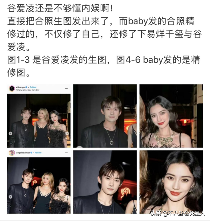 这次也是一样,杨颖和谷爱凌,都晒出了和易烊千玺的合影,但眼尖的网友发现,谷爱凌和杨颖晒出合影大有不同,杨颖发的合影是精修图,而谷爱凌发的却是原图。