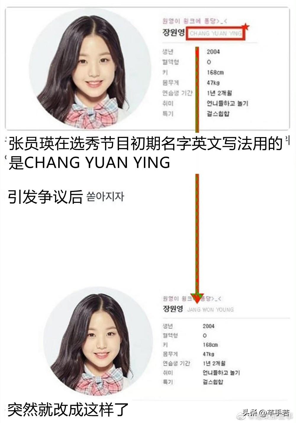 可以看到张元英在参加选秀初期的名字还是“CHANG YUAN YING”,引发争议之后,突然就改成了“JANG WON YOUNG”,这些东西只要大家想查,都是可以找到证据的,甚至就连当初的报道都能看到,这件事当初能压下去也是张元英足够厉害,这就是是钞能力。