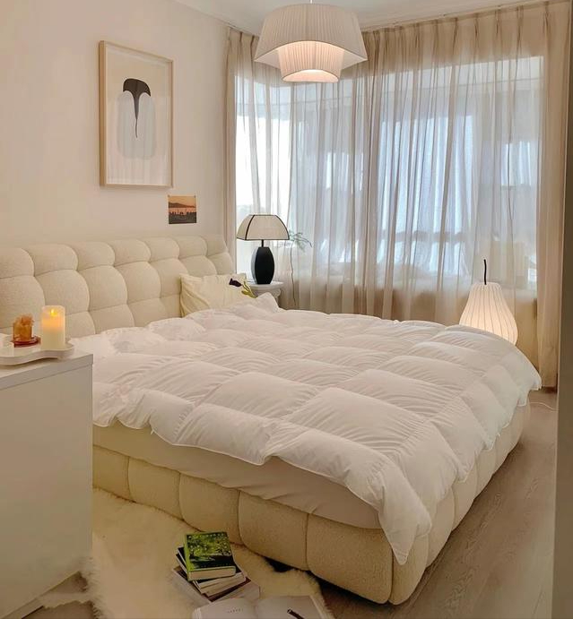卧室布置得非常温馨,乳胶漆、床和床品都是奶白色,墙壁上也没有使用很复杂的设计,只坐了一圈石膏线,虽然很简单,但是却很大方,也很别致。当室外的光线透过窗户进入室内,整个室内就会弥漫出一种很温馨的感觉。在这样的卧室中休息,睡眠质量也会提高很多。
