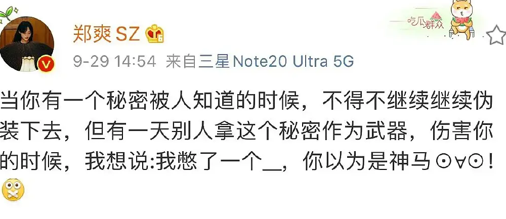 在去年9月份的时候,也就是郑爽告张恒那个时期,两人当时的发文在现在看来其实是暗藏玄机,早就暗示了一切,张恒表示自己有更重要的事和人去保护,应该指的就是孩子了,而郑爽表示自己的秘密被知道然后被威胁,估计也是指的这件事情。