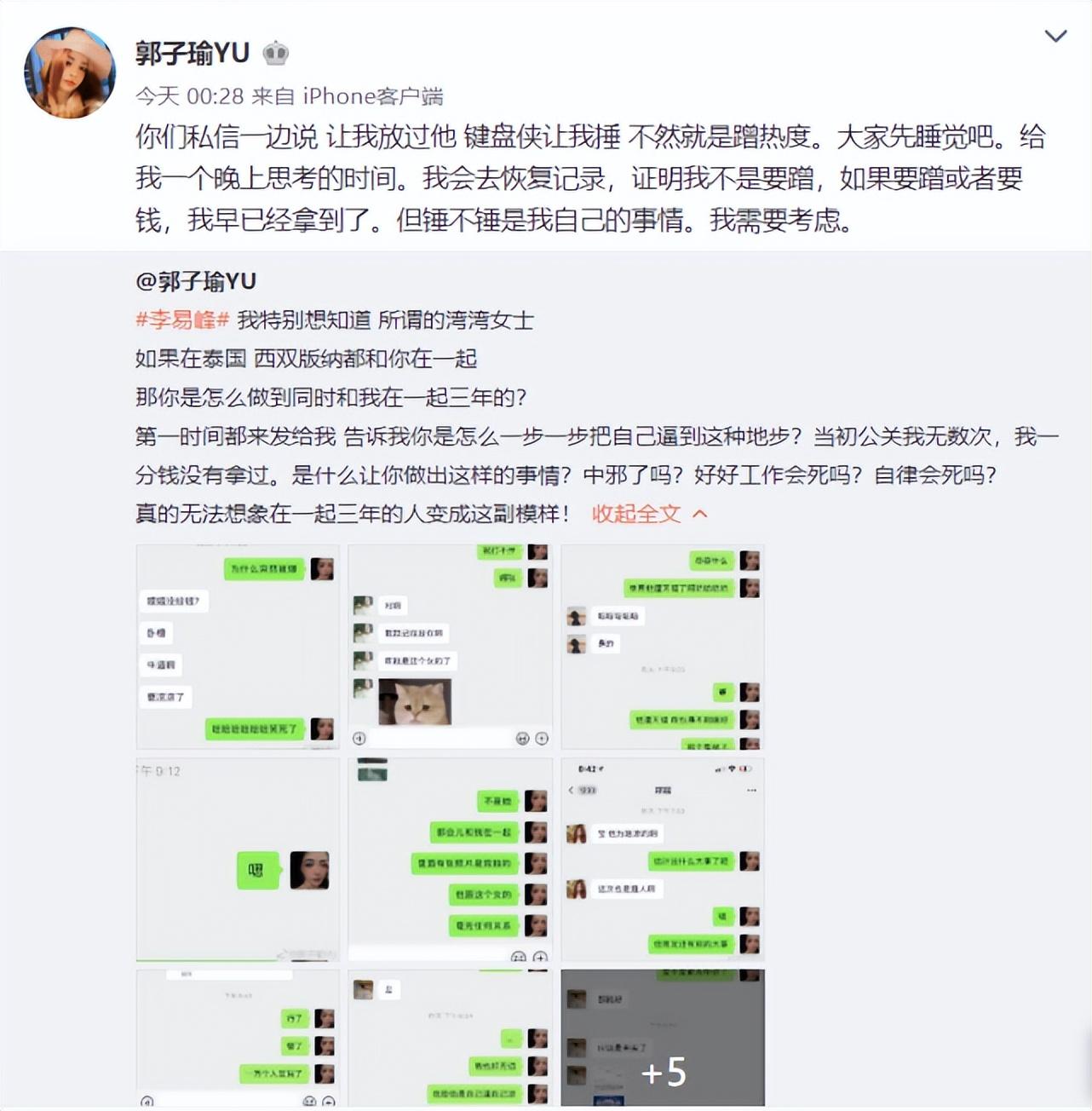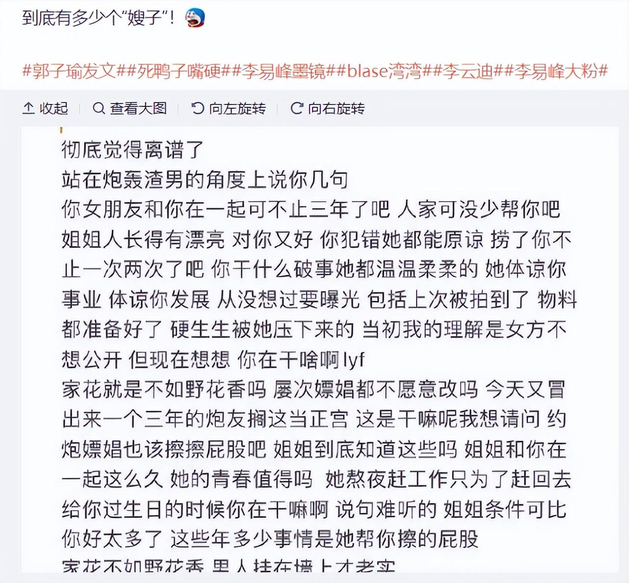 随着李易峰被通报,越来越多的人开始发文自曝“嫂子”身份,其中郭子瑜便是其中一位,也是最早发声的一位。
