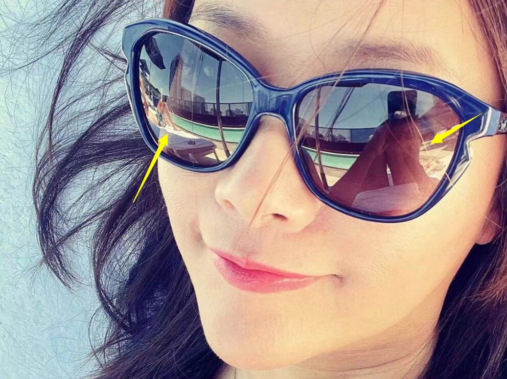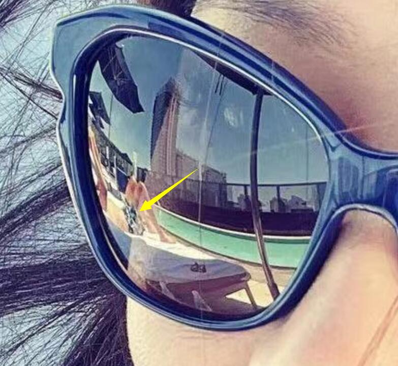 仔细看徐静蕾的墨镜反光里又一位男子的身影。他上半身一丝不挂,下半身则穿着花短裤摊在海滩上的躺椅上。另一个墨镜的框框里,这位男子则拿着手机给徐静蕾拍照——