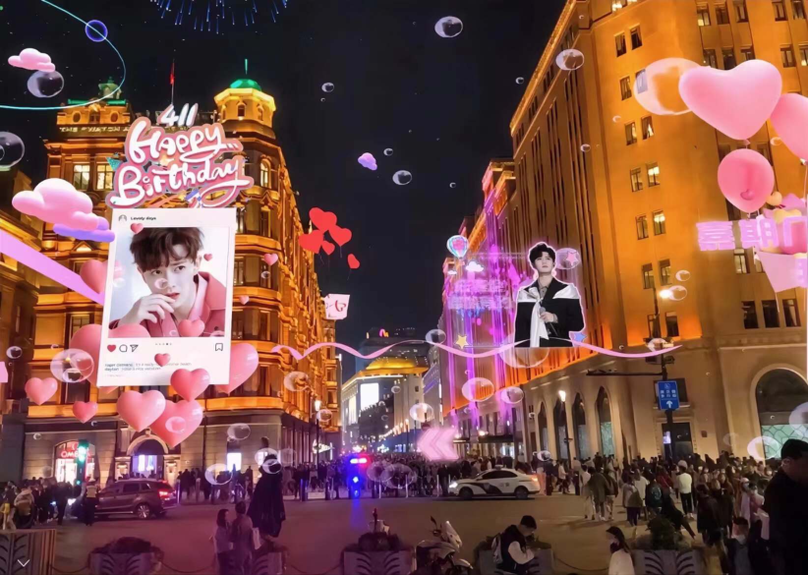 在这场以“任嘉伦”为核心的梦幻生日派对,粉丝不仅可以看到虚拟的图像、动画和灯光效果,而当各种不同造型的任嘉伦出现在面前、与现实世界的建筑、景观、人群等相互作用时,一种全新的艺术形式也得以呈现,全方位沉浸式的视觉体验让人流连忘返。