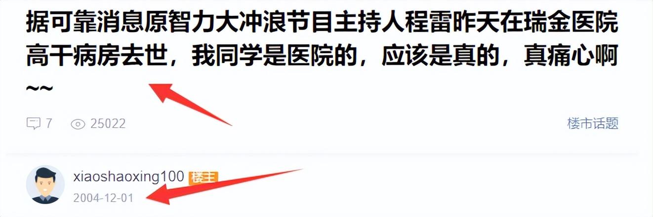 2004年,程雷就被造谣去世,连去世地点都和这次造谣的一样,都是上海瑞金医院。