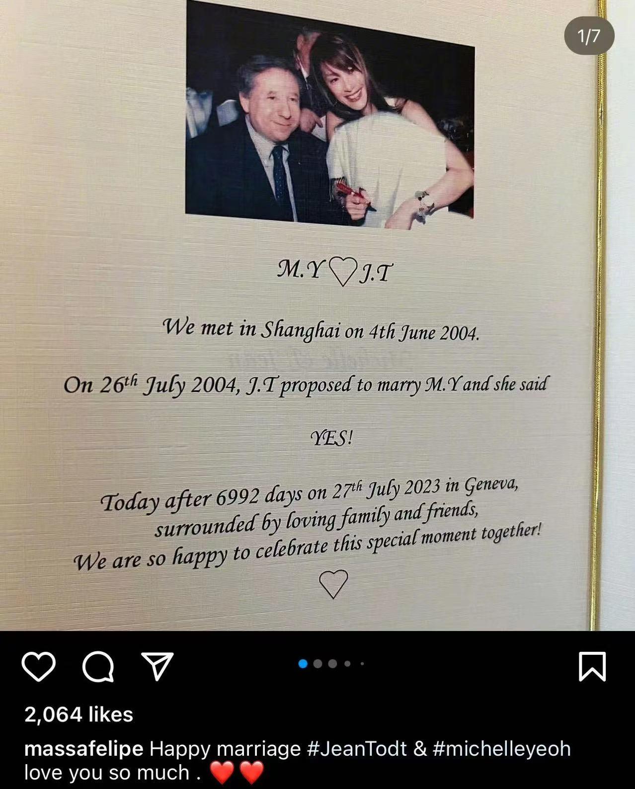 值得一提的是,车手菲利普·马萨还晒出了婚礼的邀请卡片。卡片上写到“ 我们2004年6月4日在上海相识,2004年7月26日,让·托德向杨紫琼求婚,她答应了。在6992天之后,7月27日在日内瓦,很高兴我们在家人朋友的陪伴下,一起庆祝了这个特别时刻。”