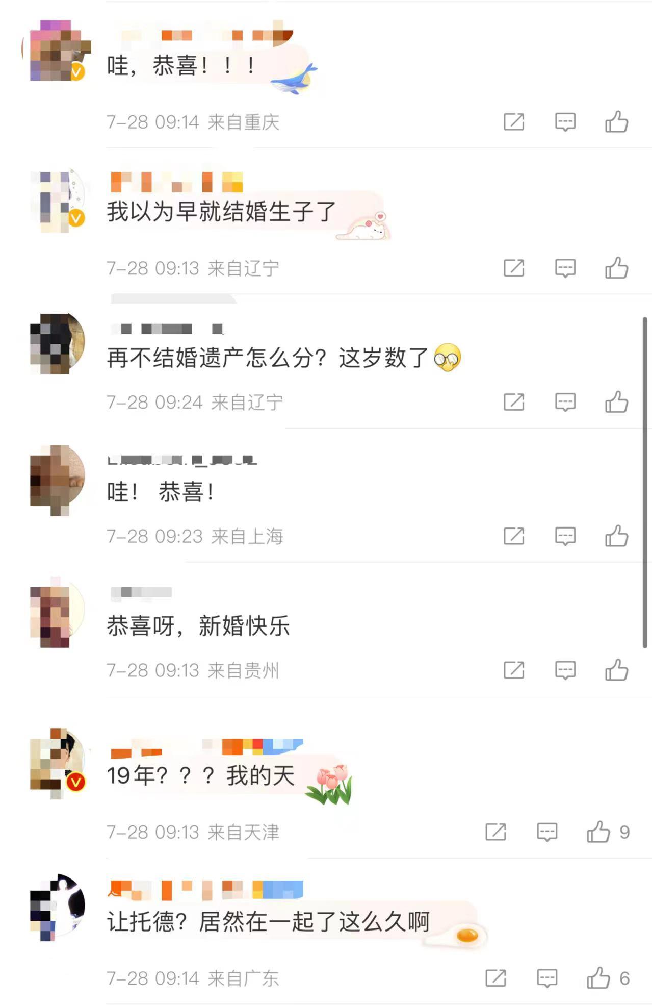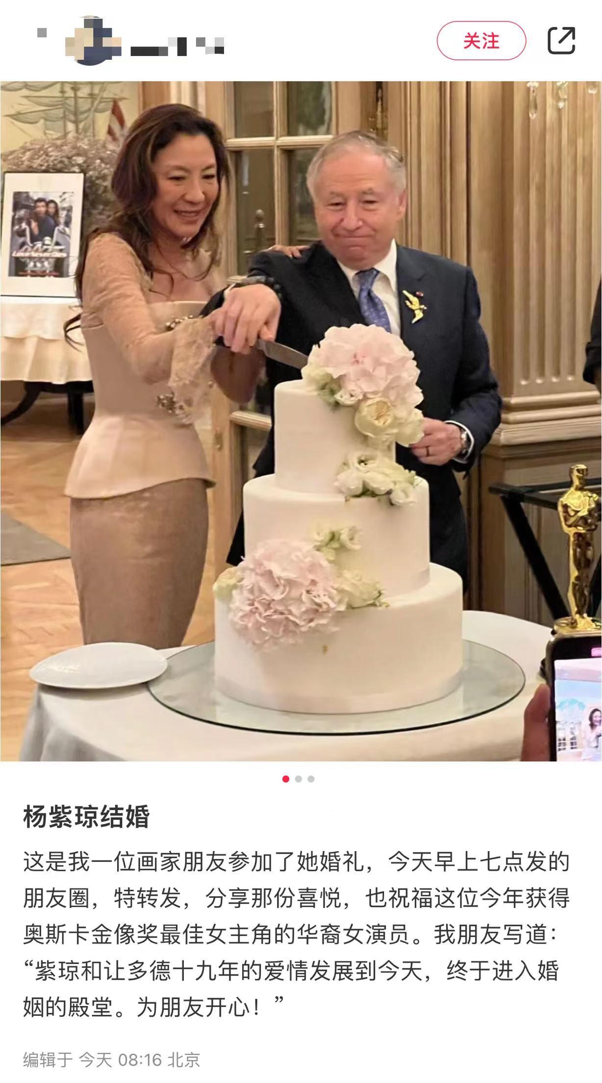 据悉,最早曝出这个消息的是一名网友,对方称自己一位画家朋友参加了杨紫琼的婚礼,并在今天(28日)早上7点发朋友圈,分享喜悦的心情,文中写到:“紫琼和让·托德十九年的爱情发展到今天,终于进入婚姻的殿堂,为朋友开心!”