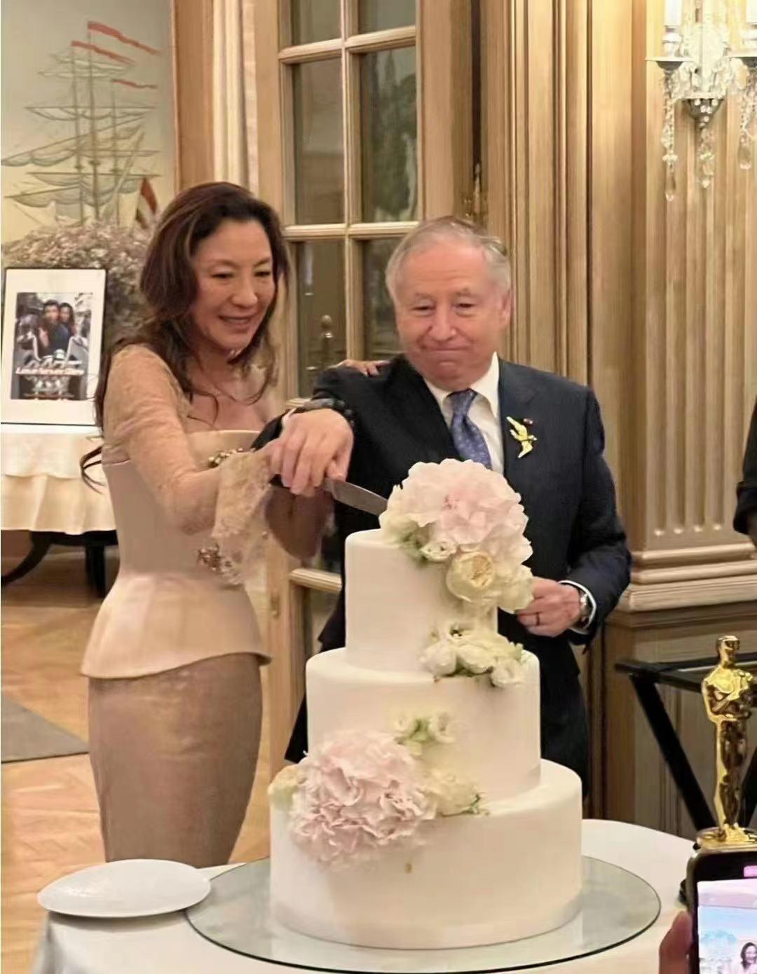 婚礼似乎在一家高档的餐厅举行,现场金碧辉煌宛如宫殿。不过,婚礼仪式十分简单,杨紫琼和让·托德只是签订了证书,一块切了一个漂亮的三层蛋糕,蛋糕旁金色的奥斯卡奖杯十分引人注目。