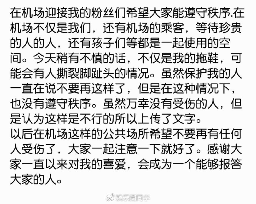 以后在机场这样的公共场所希望不要再有任何人受伤了,大家一起注意一下就好了。 感谢大家一直以来对我的喜爱,会成为一个能够报答大家的人。