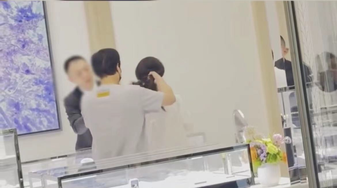 二人吃饱喝足后,陈金飞搂着女友逛奢侈品店,豪掷金钱讨女方欢心。在挑选项链时,他贴心地帮对方挽头发,女方皮肤白皙,鹅蛋脸瞩目。