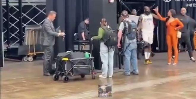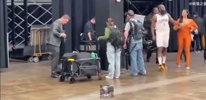 两人似乎是之前就认识,还挺熟悉,一边开着玩笑,哈登和比尔妻子有说有笑,郎情妾意。