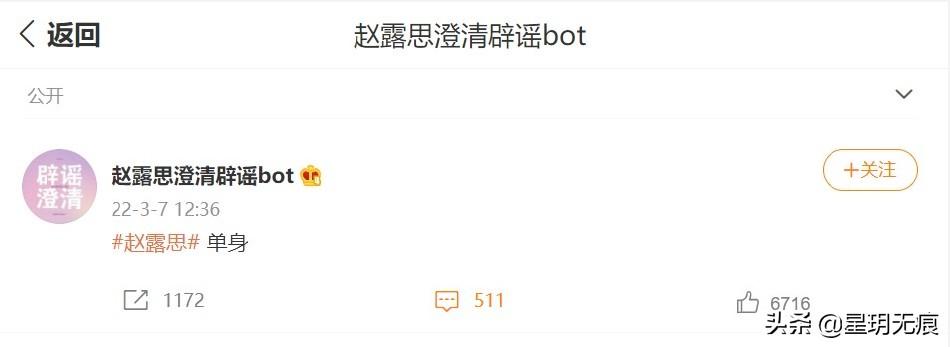 2022年3月7日,“赵露思澄清辟谣bot”发布了一条微博:“单身”,澄清网络上盛传的赵露思恋爱绯闻。据该微博账号发布的介绍博文显示,该账号为官方澄清微博,隶属于赵露思全国后援会。据悉,此前,赵露思和某男艺人因戏生情的传闻在网络上传播并引起热议。