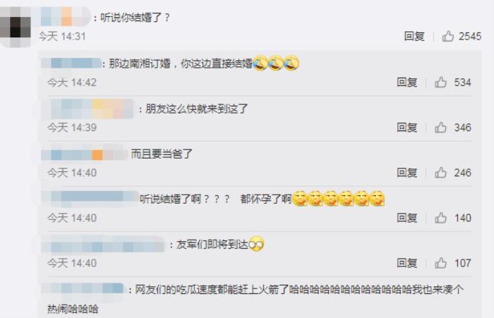 而吃瓜网友们可按捺不住好奇的心情,分别跑去两人的微博下面留言。在姜潮昨天发的短视频中,第一个就是“听说你结婚了?”网友在下面也纷纷评论道“那边是南湘订婚,你这边是直接结婚还有了孩子?”
