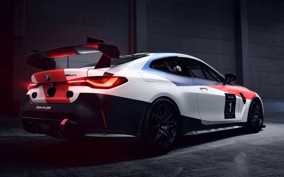 宝马 M4 GT4 在外观上采用的类似宝马 M4 GT3 的外观设计元素,夸张的车身涂漆,熏黑多辐式的轮毂造型,巨大的扰流板,贴于地面的车身使得它的攻击性看起来十足。