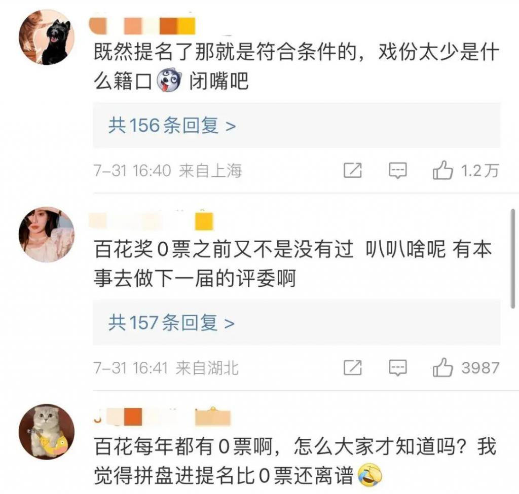 两位演员的最新作品都得到了大众的认可,票房成绩也十分可观,却在百花奖的投票中获得 0 票,导致网友们质疑百花奖的公平性。