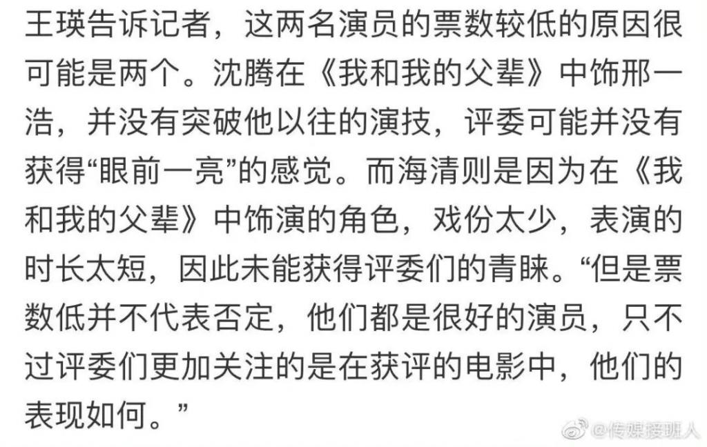 王瑛也分析沈腾和海清票数低的原因可能有两个: