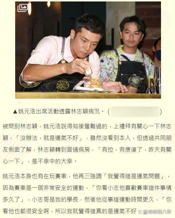谈及林志颖车祸一事,姚元浩称自己也喜欢赛车,认为赛车是非常安全的运动:" 你看小志他喜欢赛车这件事情多久了,然后他从事这运动时间更久,你看他也都很安全啊,所以我就觉得这真的是运气不好。"
