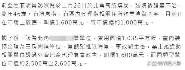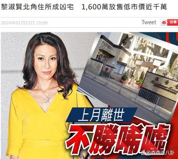 1 月 23 日晚,港媒爆料指,黎淑贤生前所居住的豪宅,目前已经被定性为 " 凶宅 ",正在市场上放售,要比市场均价低 1000 万。