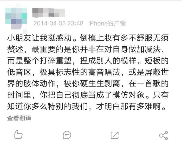 小编也翻到当年观看这期《百变大咖秀》的一位网友的评价:“小朋友让我挺感动。倒模上妆有多不舒服无须赘述,最重要的是你并非在对自身做加减法,而是整个打碎重塑,捏成别人的模样。短板的低音区,极具标志性的高音唱法,或是屏蔽世界的肢体动作,被你硬生生剥离,在一首歌的时间里,你把自己彻底当成了模仿对象。只有知道你多么特别的我们,才明白那有多难啊。”