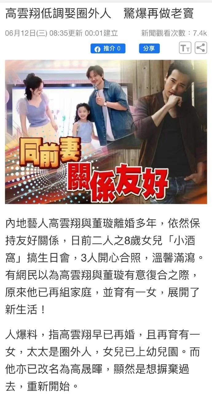 6 月 12 日,据港媒,知情人爆料,高云翔早已再婚,且再育有一女,太太是圈外人,女儿已上幼儿园。