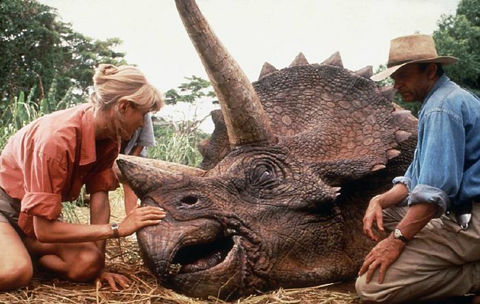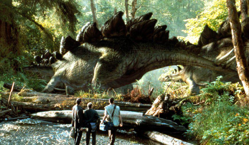 《侏罗纪公园》(1993),山姆·尼尔、劳拉·邓恩、杰夫·高布伦主演,讲述了哈蒙德博士召集大批科学家利用凝结在琥珀中的史前蚊子体内的恐龙血液提取出恐龙的遗传基因,将已绝迹6500万年的史前庞然大物复生,使整个努布拉岛成为恐龙的乐园,即“侏罗纪公园”。但在哈蒙德带孙子孙女首次游览时,恐龙发威了。图片来源:高品图像