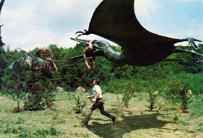 《被时间遗忘的土地》(1975),两对新婚夫妇乘船前往波多黎各的胡安度蜜月,途中遭遇一场恐怖的暴风雨而搁浅。众人乘坐救生艇前往一座小岛,却遭到一亿年前已经灭绝的恐龙的袭击。原来他们已置身一个无时间的空间,当他们准备逃离小岛时,却发现小船不知去向……图片来源:高品图像