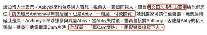 而根据知情人透露,蔡天凤曾在何文田加多利山为前夫一家买豪宅,又为前夫胞兄Anthony买房。Anthony后来没工作,便让其担任自己的私人司机。这些年来,蔡天凤一直拿钱接济前夫一家。没想到邝家不感恩,还将其残忍杀害……据悉在调查初期,前夫胞兄Anthony被警察索要行车记录仪时,声称已坏,阻碍警察办案。