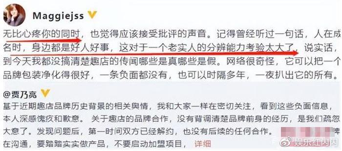 结果没想到贾乃亮的姐姐贾珊,竟然转发了弟弟道歉的文章,并且还发表了一段自己的感慨。贾珊开篇第一句,就是称自己无比心疼贾乃亮,文中还夸赞贾乃亮是一个老实本分的人,所以才没有分辨趣店事件,把锅都甩给了罗敏,称是资本把一个品牌包装净化的很好,乃至趣店一条负面新闻都没有,结果事隔多年一夜之间就扒出了这么多负面新闻。网友吐槽贾珊根本就是在阴阳怪气,觉得有人在故意针对贾乃亮。